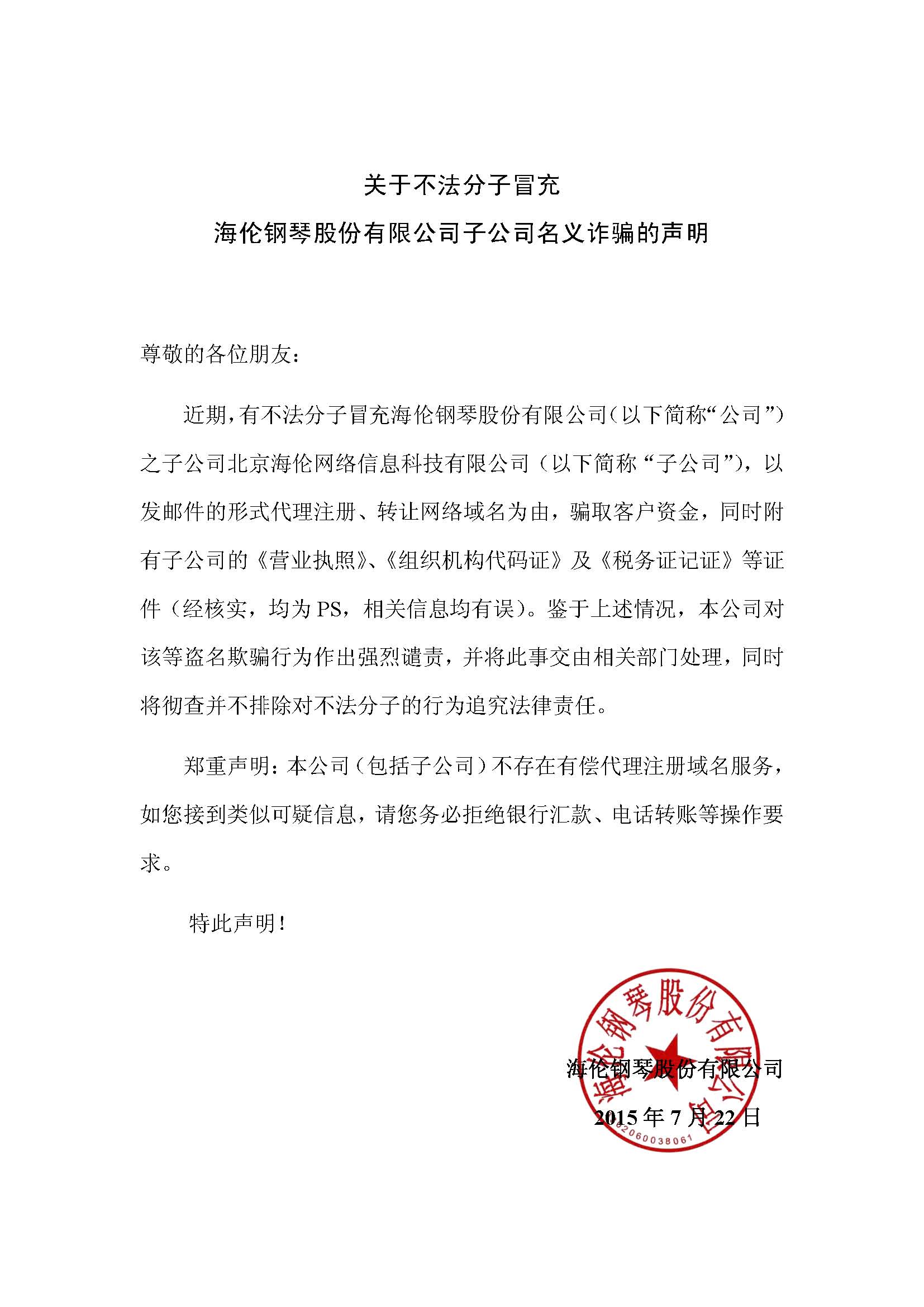 關于不法分子冒充海倫鋼琴股份有限公司子公司名義詐騙的聲明